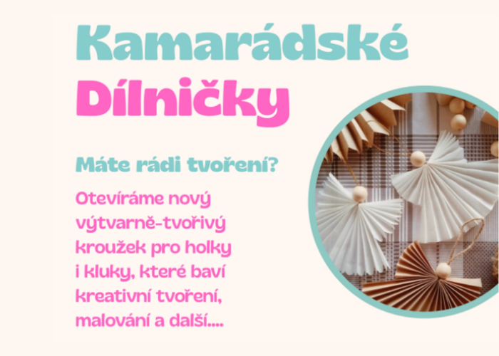 Otevíráme nový výtvarně-tvořivý kroužek pro holky i kluky, které baví kreativní tvoření, malování a další... Kroužek bude zaměřený na téma blížících se svátků (např. Vánoce, Velikonoce, Den matek atd.), děti budou tvořit i podle své fantazie.